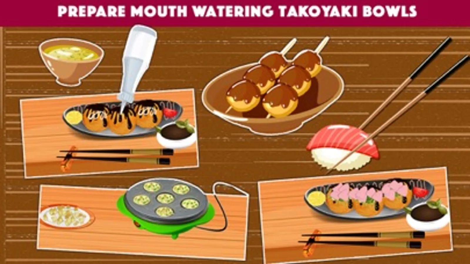 Ready to make some tasty Japanese food? Your favorite Japanese cuisine is here for you to try your hand at making. Cook Sushi, Japanese Noodles, Tempura & mouth watering takoyaki bowls at your own Japanese restaurant...