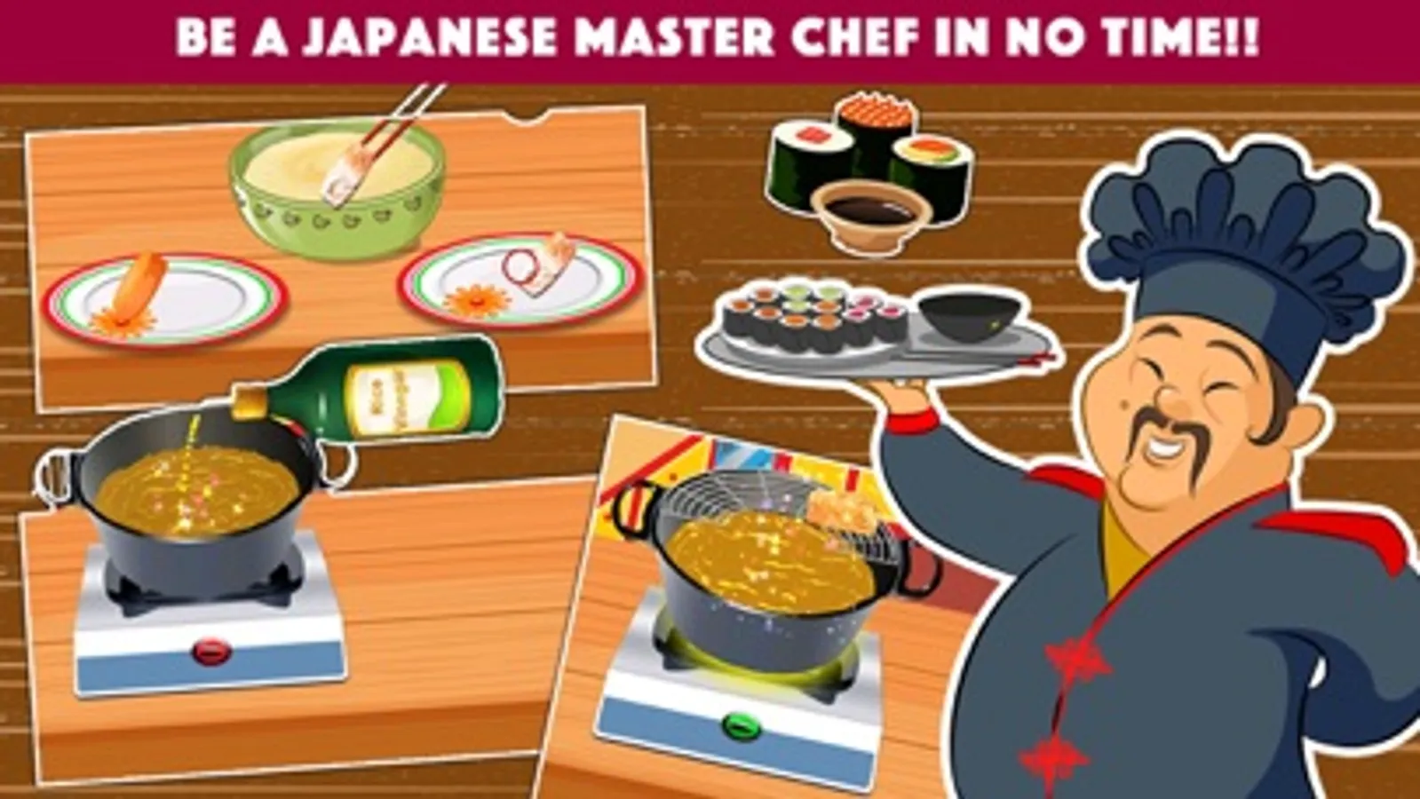 Based on kids favorite recipes, Japanese Cooking Mania game will help children learn how to cook popular Japanese Food..!