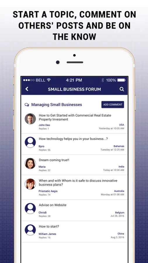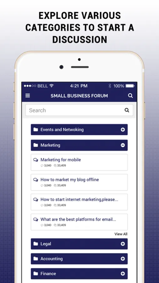 Small Business Forum - Ideas & Opportunities is an innovative mobile app for small business owners and other business professionals, to seek solutions for the unique challenges of starting and running a small business. Solutions are provided by other members of the forum. The app connects you to the community of small business owners, marketing professionals, IT personnel, accountants, managers and other people playing key roles in small businesses. It lets you tap into the potential of their knowledge, wisdom and experience.