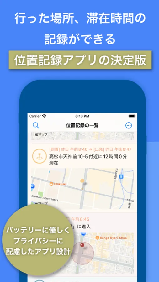 ※本アプリは位置情報を本アプリ内(ローカル)に保存します。個人情報が含まれない緯度と経度の情報のみ住所、地理名称を取得するためにApple社とのセキュアな回線で通信が発生します。