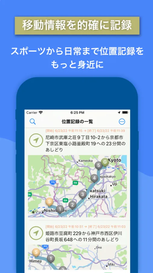 ※正常に記録されない場合は、[設定]>[プライバシー]>[位置情報サービス]>[位置記録(本アプリのアイコン)]>[常に許可]になっていることをご確認ください。