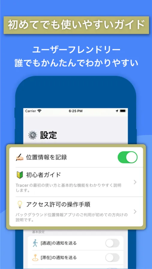 ※このアプリでは一般的なGPSトラッカーとは異なり、メートル単位秒単位の詳細なデータを記録することはできません。生活に役立つレベルの位置情報をバッテリーの負担無くできるだけ的確に記録することを目的にしています。