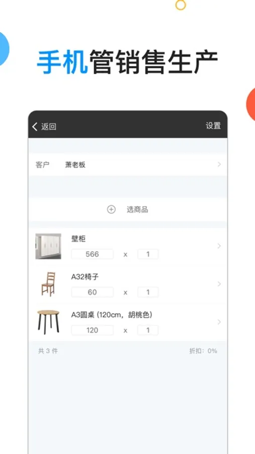 2. 销售、生产全程拉通,所有人按业务流程紧密协作。设计师进行产品设计,生产主管排产,销售员开单、财务收款、经理老板看报表。