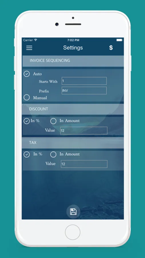 → Set Invoice prefix, tax, discounts, currency using "Settings"