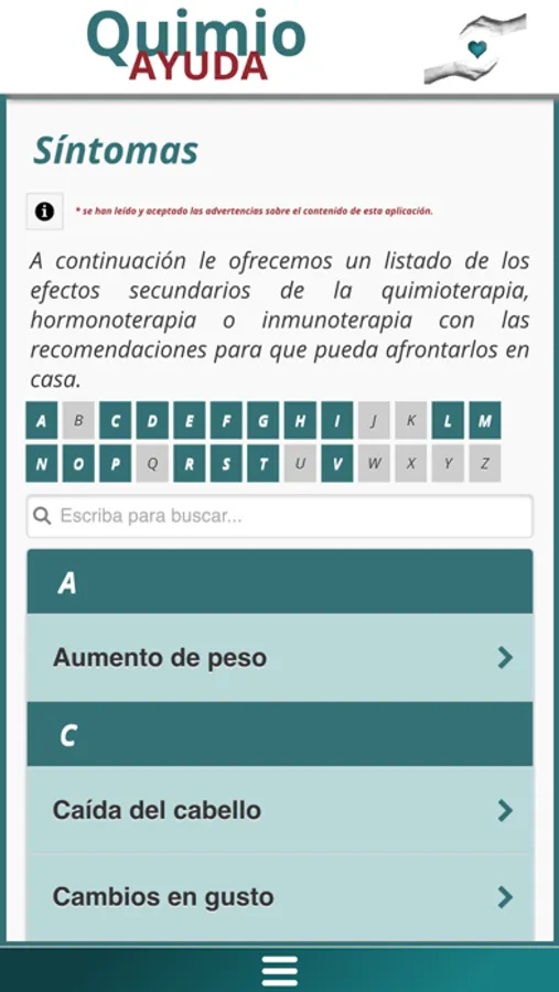 Gracias a esta aplicación podrá acceder de manera gratuita, en cualquier momento a un conjunto de consejos que puede hacer usted mismo en casa, para controlar, evitar o minimizar los temidos efectos secundarios producidos por el tratamiento con quimioterapia, hormonoterapia o inmunoterapia.