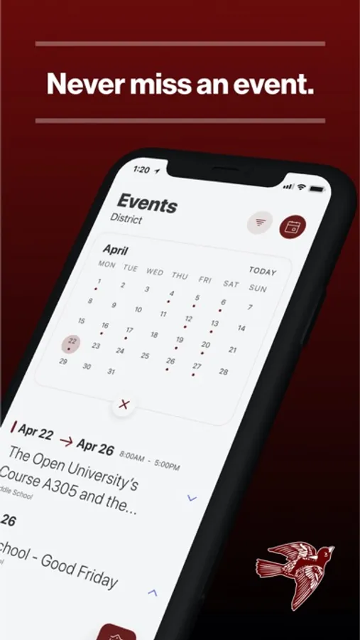 The event section shows a list of events throughout the district. Users can add an event to their calendar to share the event with friends and family with one tap.