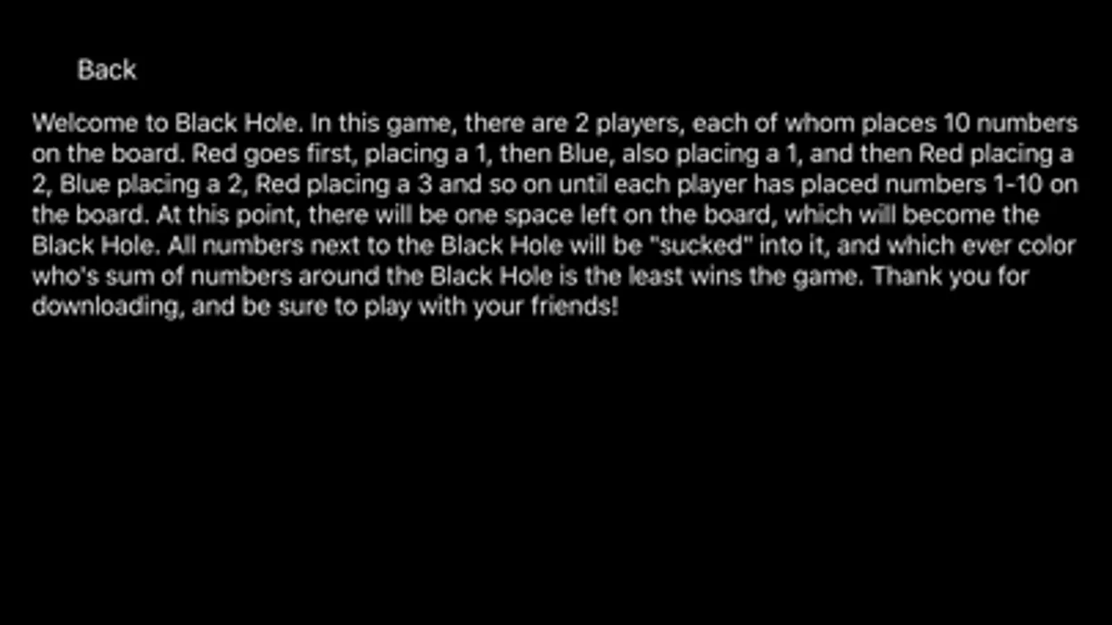 Welcome to Black Hole, which you can think about as an evolved version of Tic Tac Toe. This is a completely free game, with no ads or in app purchases, so go ahead and give it a shot!
