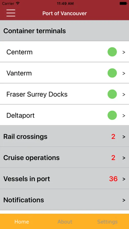 PortVan eHub: The Vancouver Fraser Port Authority’s hub for real time operational updates and terminal status at the Port of Vancouver. Use this app to view by the minute updates on the status of Port of Vancouver container terminals including truck transaction wait times. Stay up to date with status updates on active south shore rail crossings, cruise ship scheduled departure times and terminal congestion forecasts, as well as the types of vessels in port. Set up your own personal email notifications by subject to ensure you have the latest information all the time.