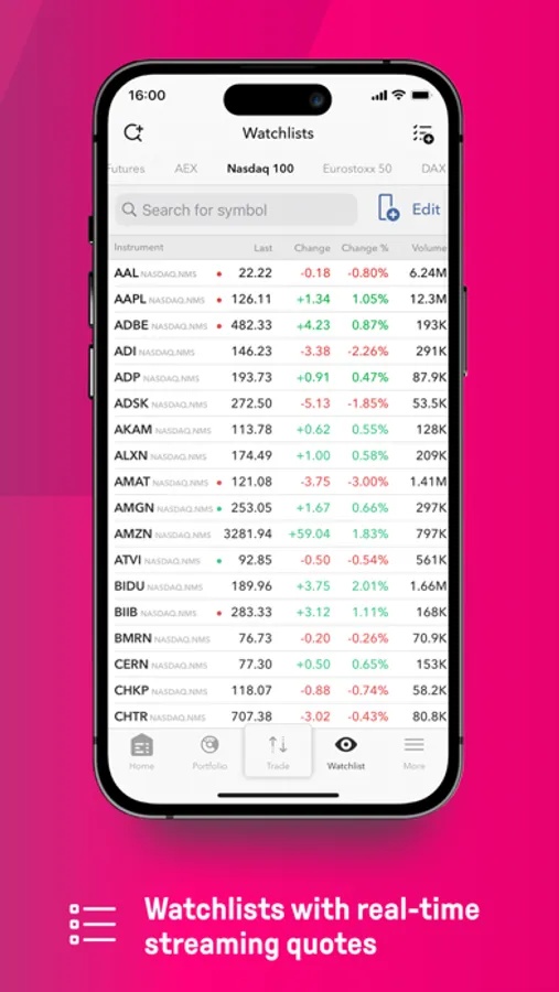 You can log in via this app when you are customer of LYNX. Don’t have an account yet? Take our mobile platform for a test drive: no registration is required to log in and view unlimited delayed quotes.