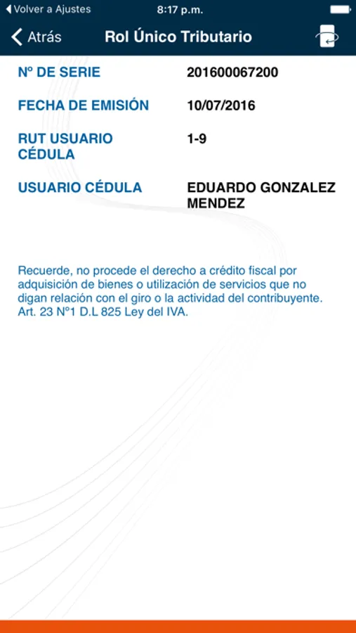 Aplicación Cédula RUT electrónica desarrollada por el Servicio de Impuestos Internos que permite identificar al contribuyente. Esta es requerida para ciertos trámites tributarios así como para realizar compras permitiendo recuperar el IVA pagado en éstas.