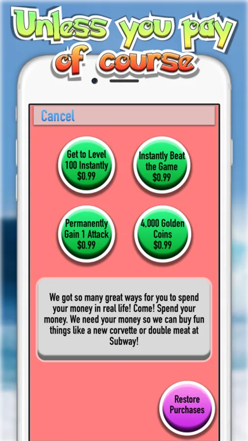 Disclaimer: This app is intended to be a satire of some of the common issues we have with free apps such as paying to win, aggressive ads, and psychological tricks used to give players the need to pay. You don't need to actually pay to play. Have fun and leave us a review if you like it!
