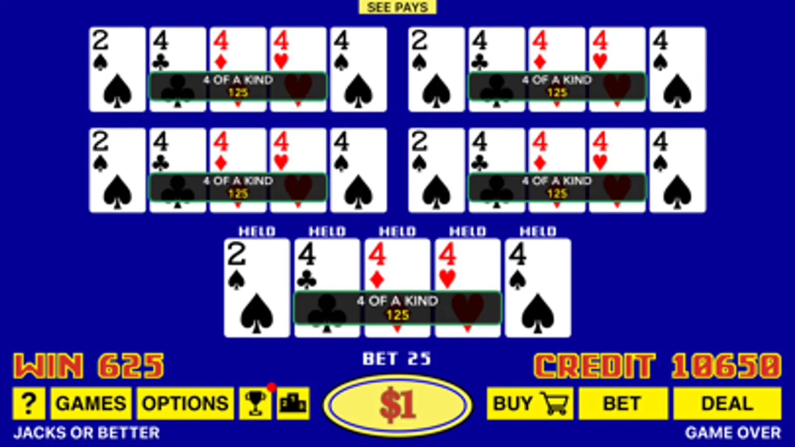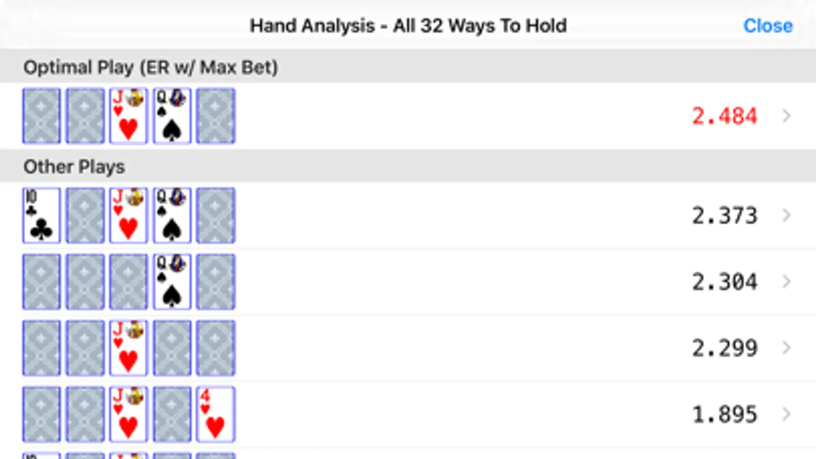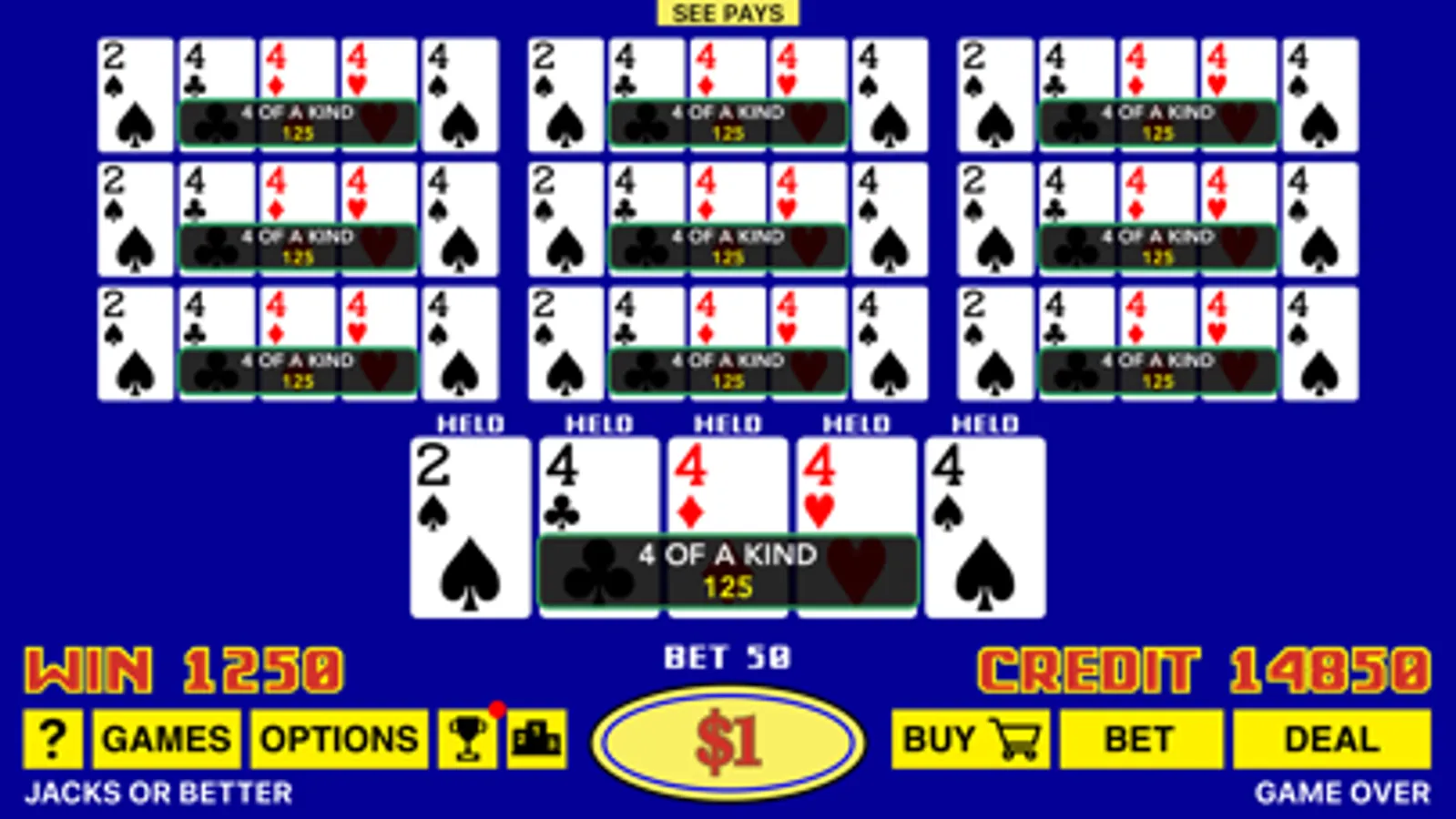 We also added the Best Play feature for the dealt hand. Best Play will show you all 32 ways of holding cards with expected returns for each play, and you should always follow the optimal strategy in order to maximize your overall return.