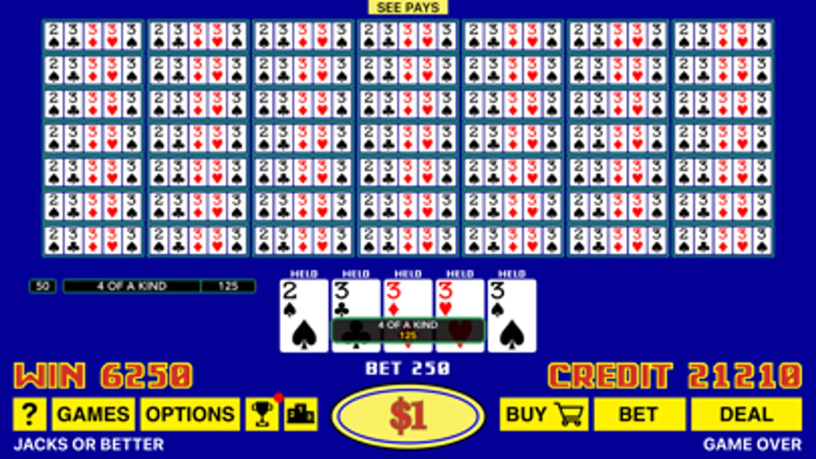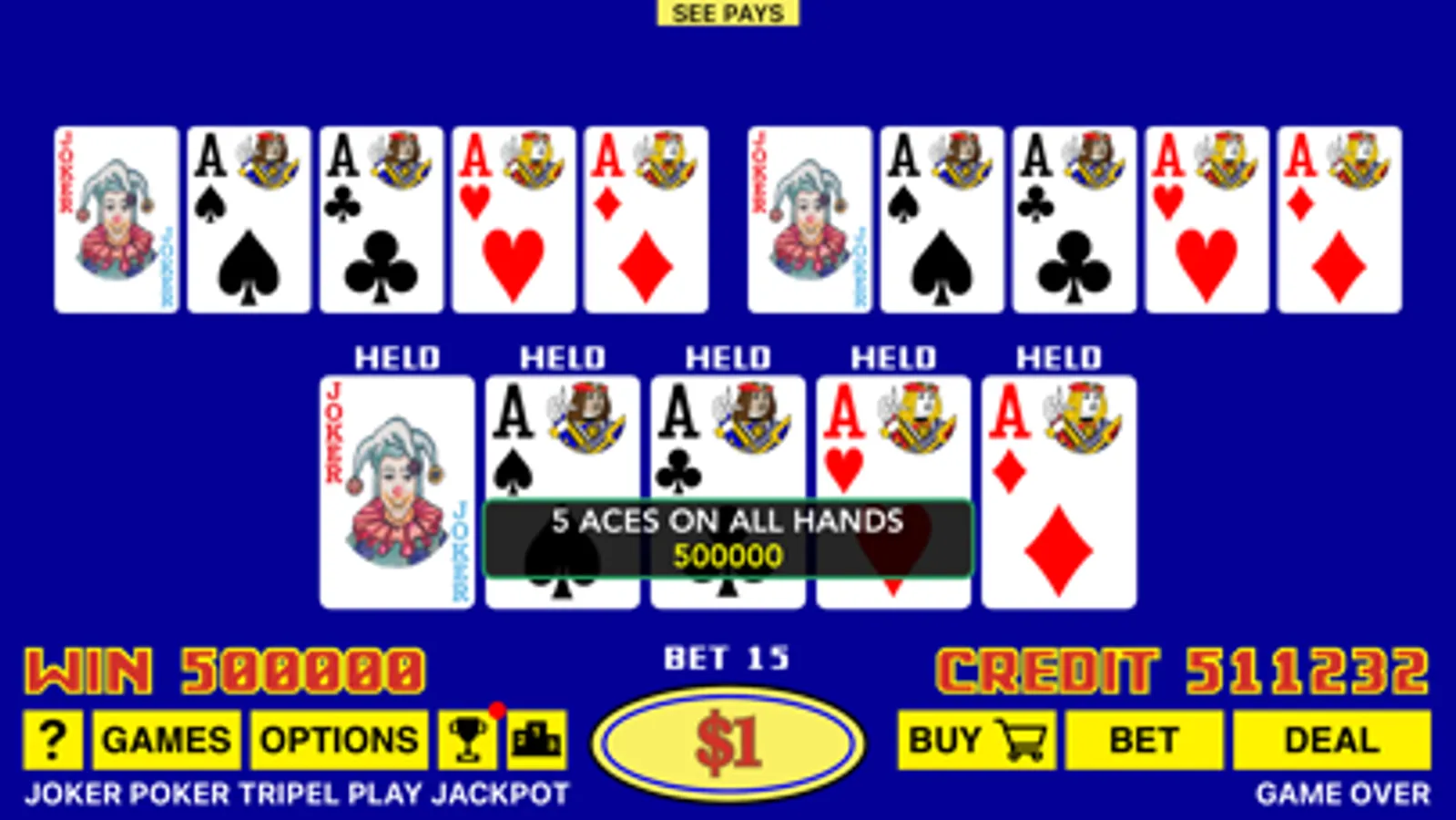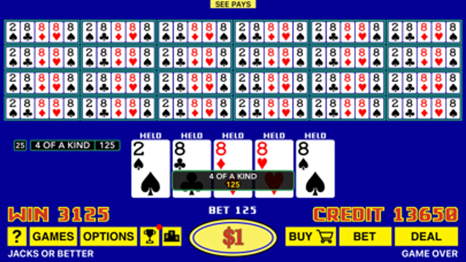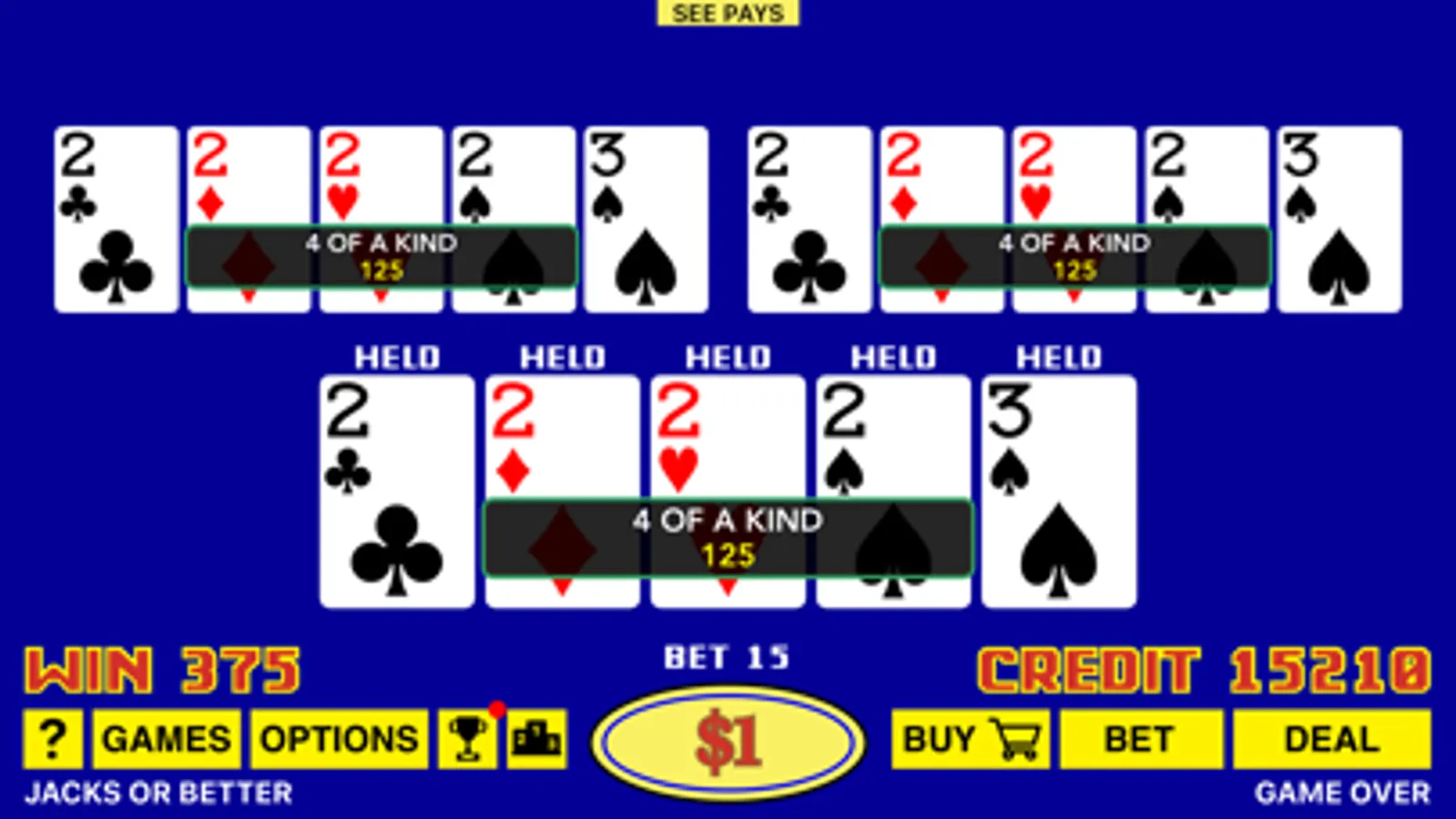 We also added the Best Play feature for the dealt hand. Best Play will show you all 32 ways of holding cards with expected returns for each play, and you should always follow the optimal strategy in order to maximize your overall return.