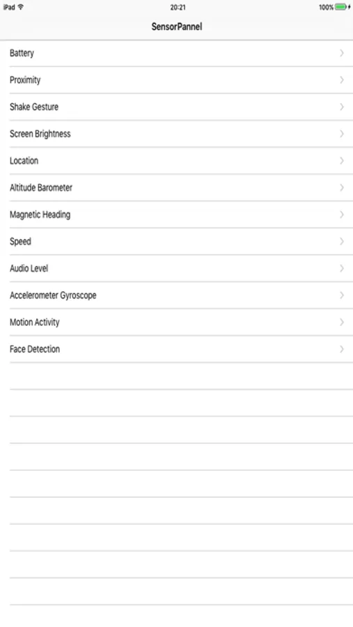 This APP provides the data of the senors such as gyroscope /battery / altitude/ barometer/ magnetic/ speed /audio level/ accelerometer /heading /brightness /location and so on.
