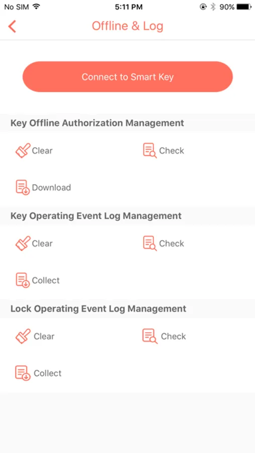 Offline & Log: Download the assigned lock authorization to Smart Key and Check or Collect event logs from Smart Key.