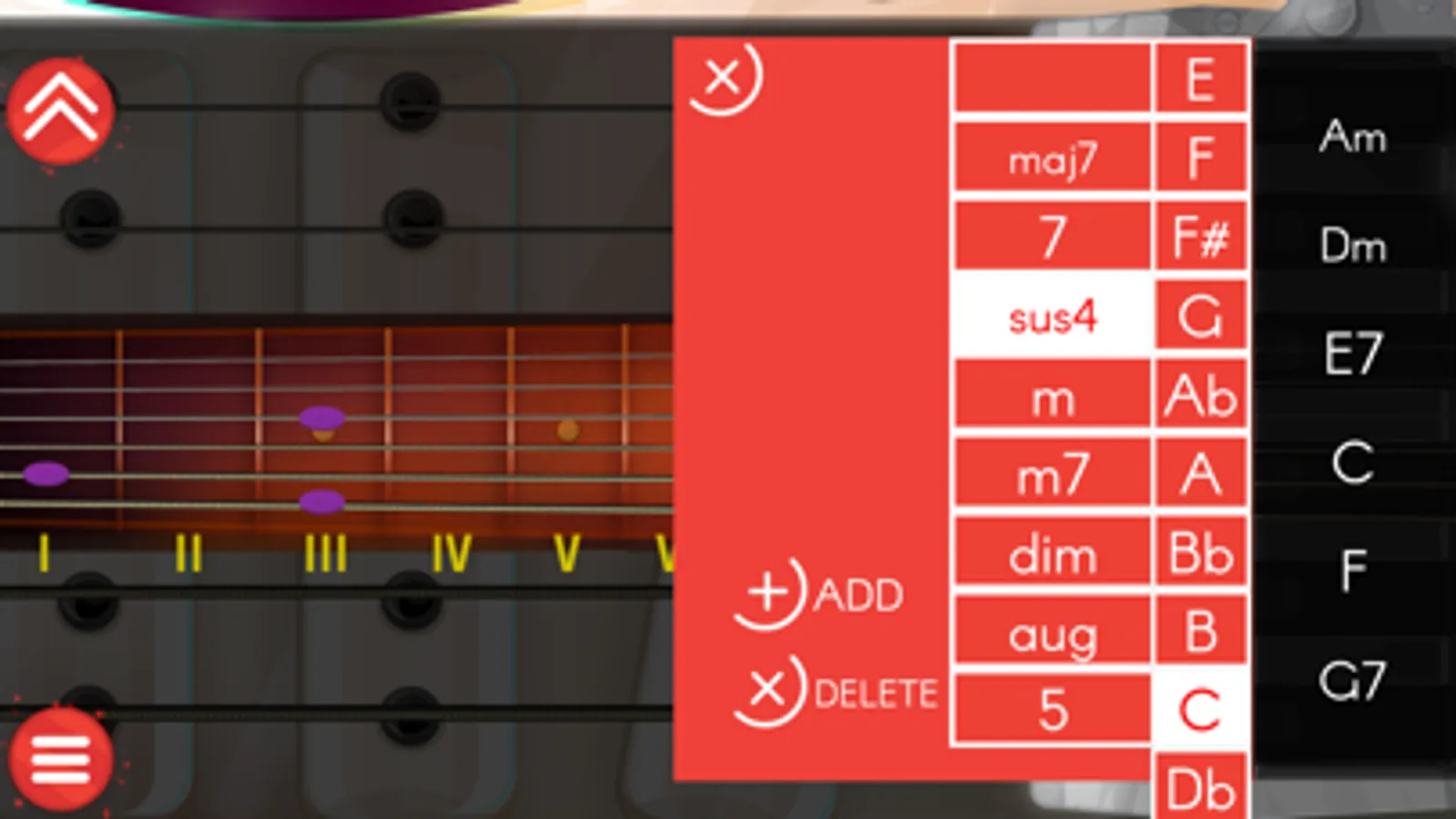 - 12 chords (maj, maj7, maj7+, min, min7, sus4, dim, aug, power chord)