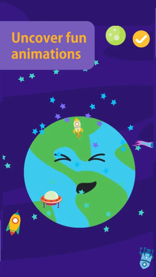 - Once the Puzzle game is complete your child will get to play with the planet and interact with them with the space shuttles and many more that shows up randomly. When they interact with these items and place them on the planet, it will make the planet produce sound and giggle.