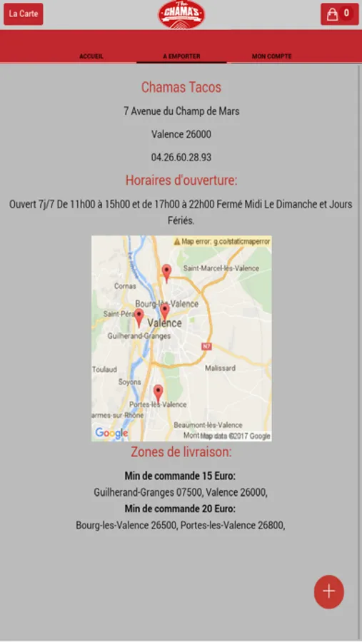 L'application Iphone/Ipad de Chamas Tacos vous permet de commander en ligne ou par téléphone via votre application . Vous pouvez consulter notre carte et choisir vos produits .