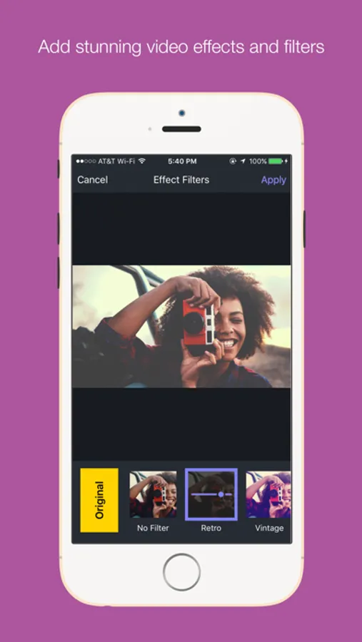 • Apply Filters - Add stunning video effects and filters to your videos to enhance with a distinctive look. Custom filter controls allows you to tweak individual settings like Brightness, Contrast, Warmth, Saturation, and more.
