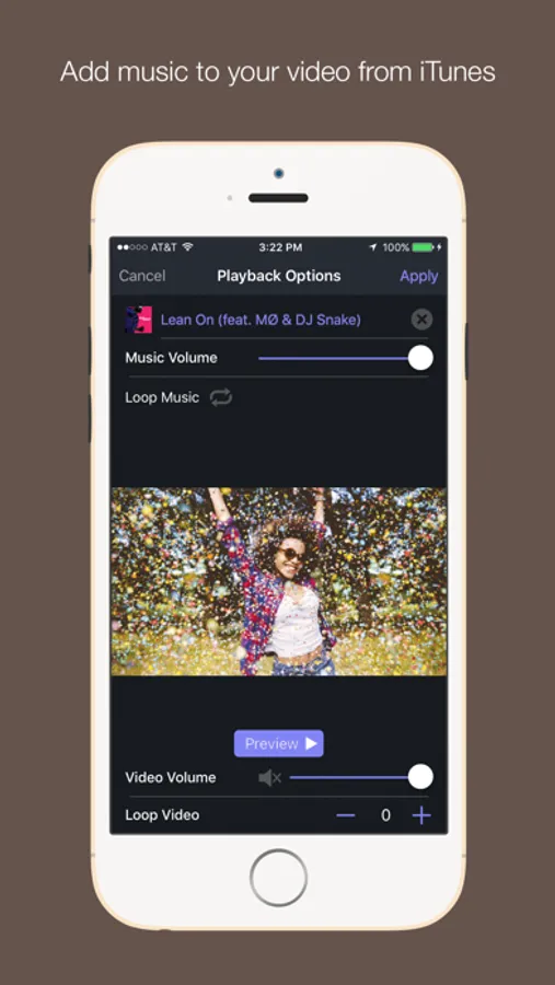 • Add Music - Import music directly from your device's iTunes library and use as a background soundtrack for your video. Easily control mixing volume of video sound and background music.