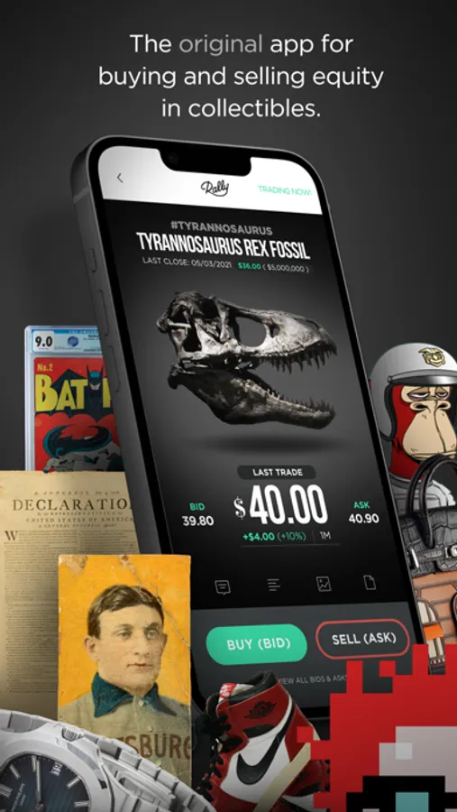 Rally allows users to Buy & Sell equity shares in the rarest assets on the planet. Each investment on Rally is hand-selected by a team of industry experts and turned into SEC-qualified stock, allowing a new breed of enthusiasts to access investments that have traditionally been reserved for a select few- everything from rare watches, sports memorabilia, blue chip NFTs, dinosaur fossils, 1st edition literature, and more!
