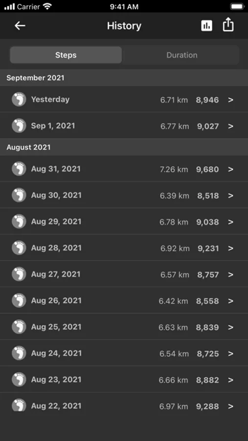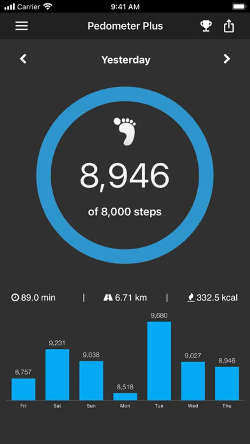 Pedometer Plus counts your steps, calculating your approximate distance, duration and calories burned every day.