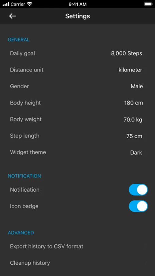 * Before use you can open 'Settings', where you can set your step length, body weight, and body height for accurate calorie and distance calculation.