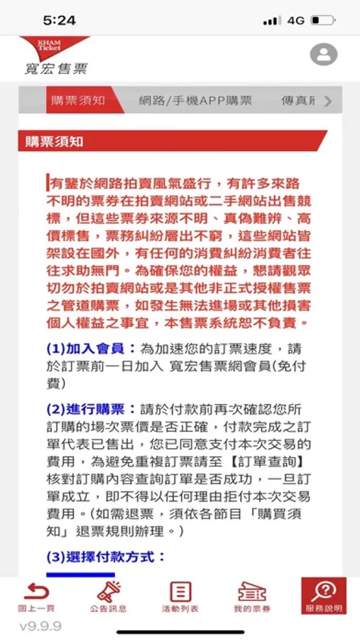 寬宏售票服務包括24小時網路刷卡/ATM購票、超商現金購取票、傳真刷卡購票以及手機線上購票。