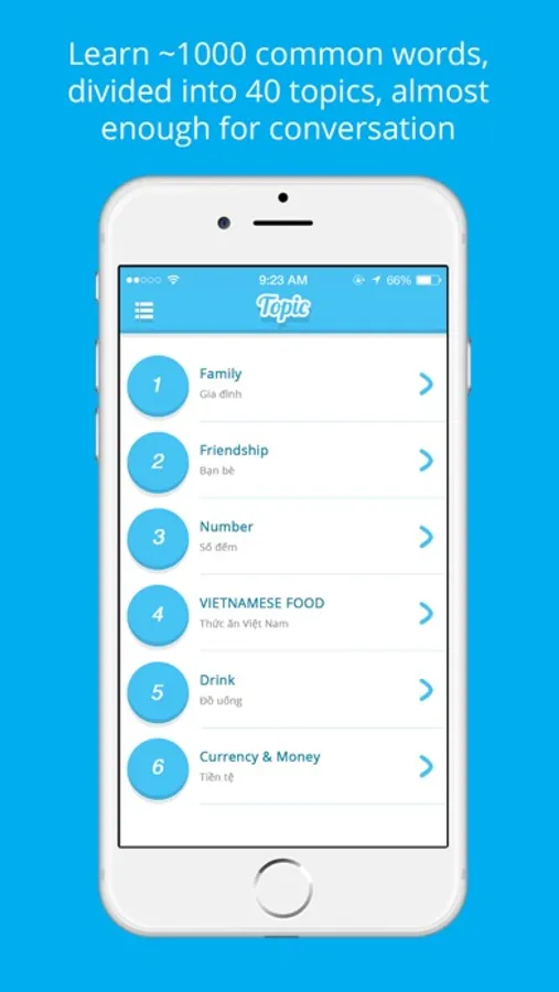 + App contains 40 topics, like: food, sightseeing, number, hour, currency, job...