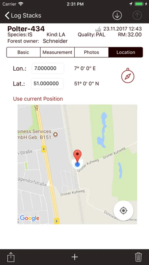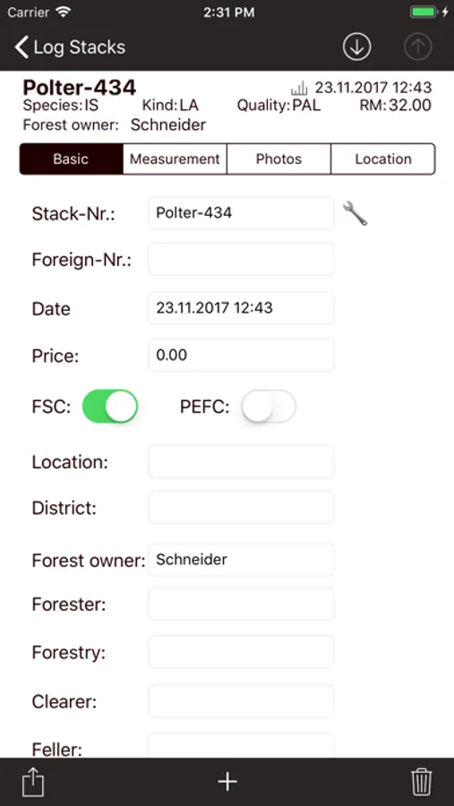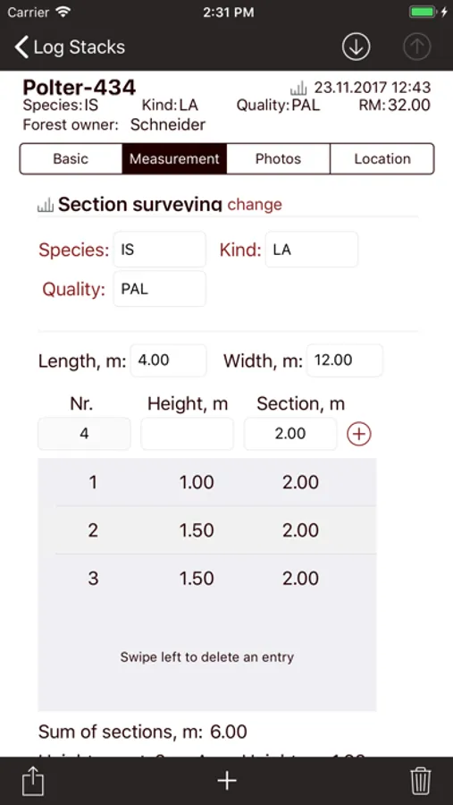 PolterApp is a user friendly mobile application for round wood measurement and inventory. It works completely offline. Beside basic data collection like woodpile owner, price, certificates, photos, geo location etc. The app features include individual trunk measurement, section measurement, estimation. Collected logging data can be exported in multiple formats, e.g. PDF, Excel, CSV, XML, KML, Email etc.