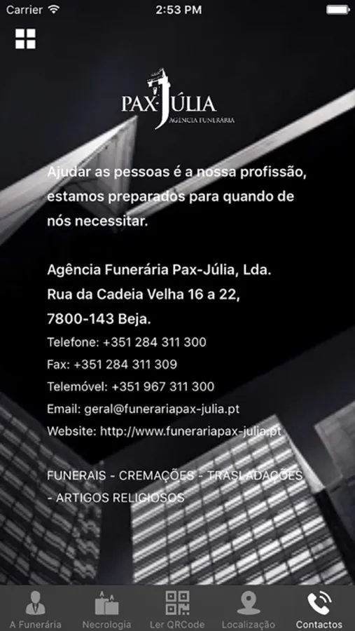 Aplicação mobile da Agência Funerária Pax-Júlia em Beja.