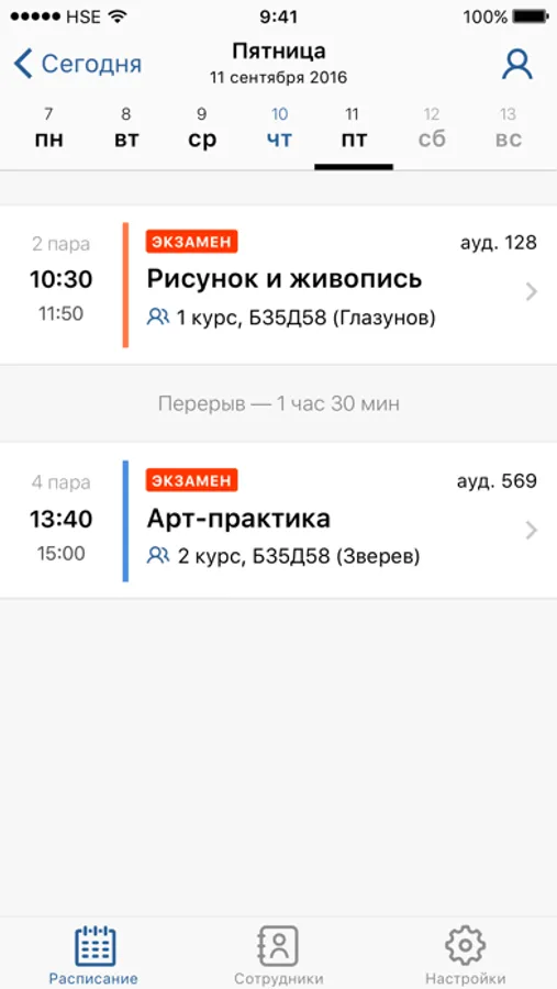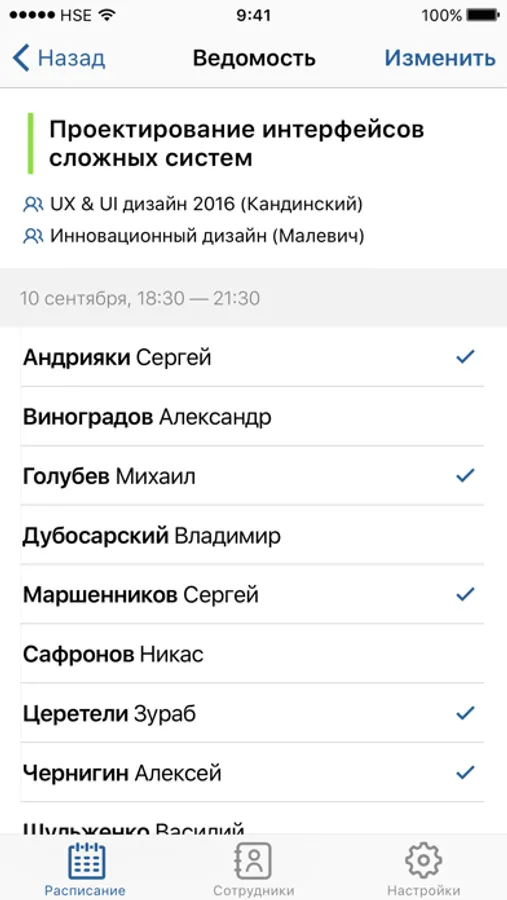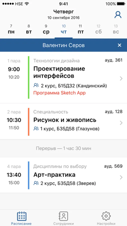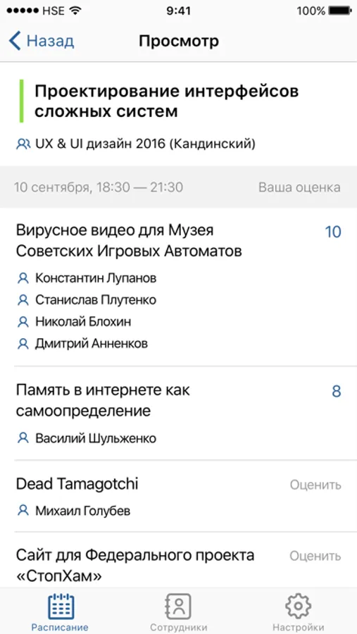 Приложение позволяет просматривать расписание преподавателей и студентов Школы дизайна НИУ ВШЭ, отмечать присутствие студентов на занятиях, а также ставить оценки на экзаменах и просмотрах.