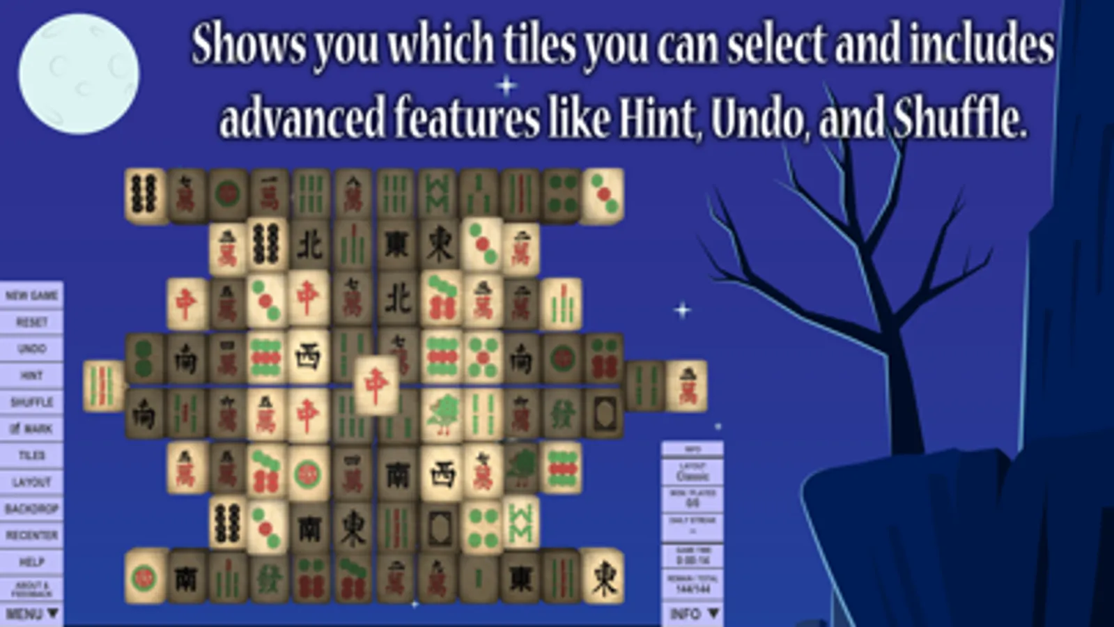 Layouts include everything from the classic mahjong solitaire layout to simple and complex patterns and shapes. Each layout is show with a rating of how easy or difficult it makes gameplay.