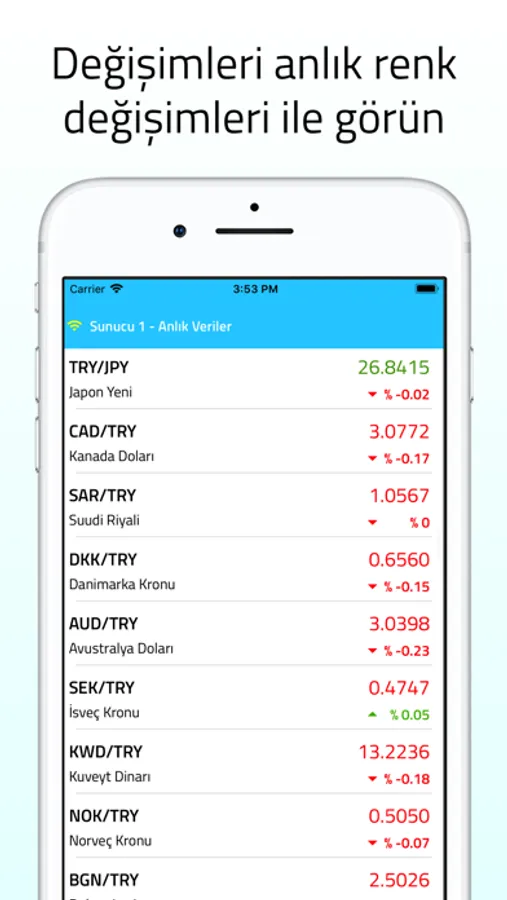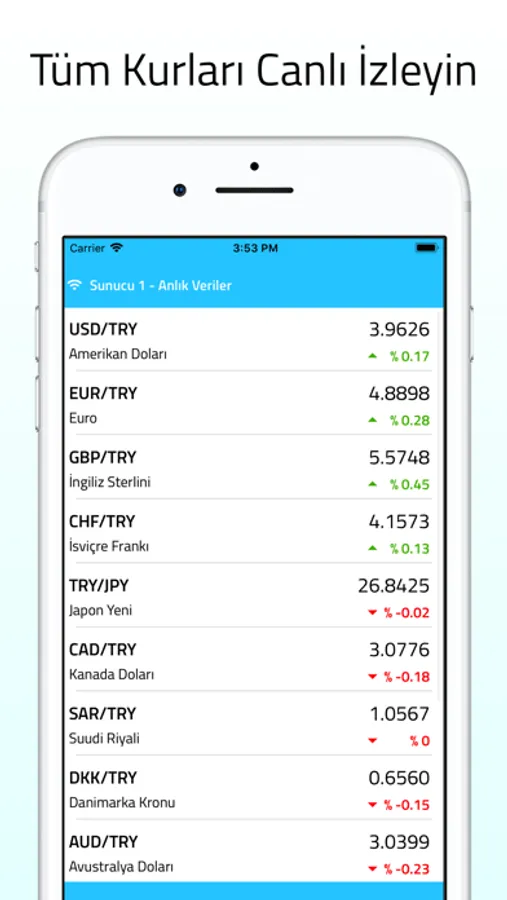 Döviz kurlarını ve tüm listelenen dolar, euro gibi kurları anlık ve %100 canlı şekilde izleyebilirsiniz.