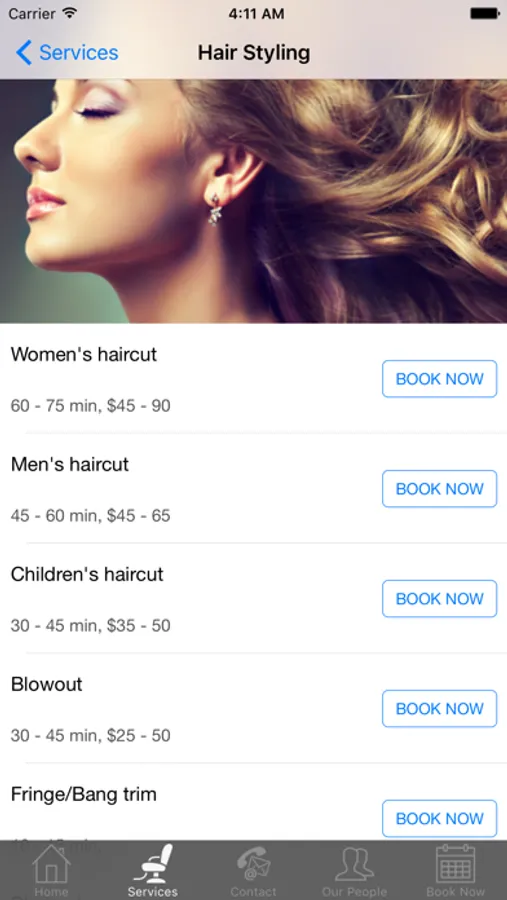 4. Services Menu. View list of services with times and prices.