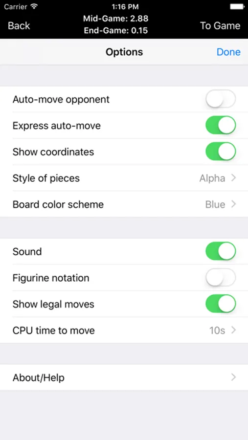 - Customizable board colors (8 options) and chess pieces (6 options)