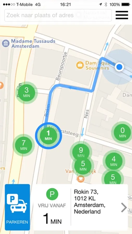 1. Via de kaart in de app een vrije parkeerplek vinden.