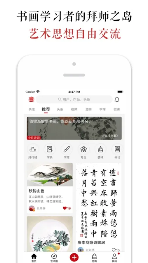 墨客岛是当今实力派书画名师艺术成果展示、原创作品交易及艺术思想交流、传播平台,也是广大的书画艺术爱好者、学生拜师学艺的互动平台。