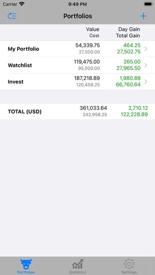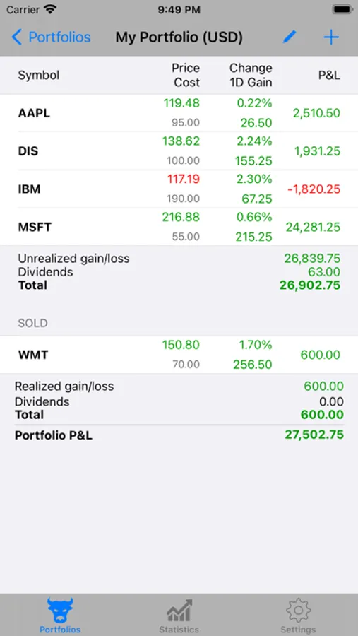 Monitor the performance of your portfolio: Current asset value, daily changes, total P&L.