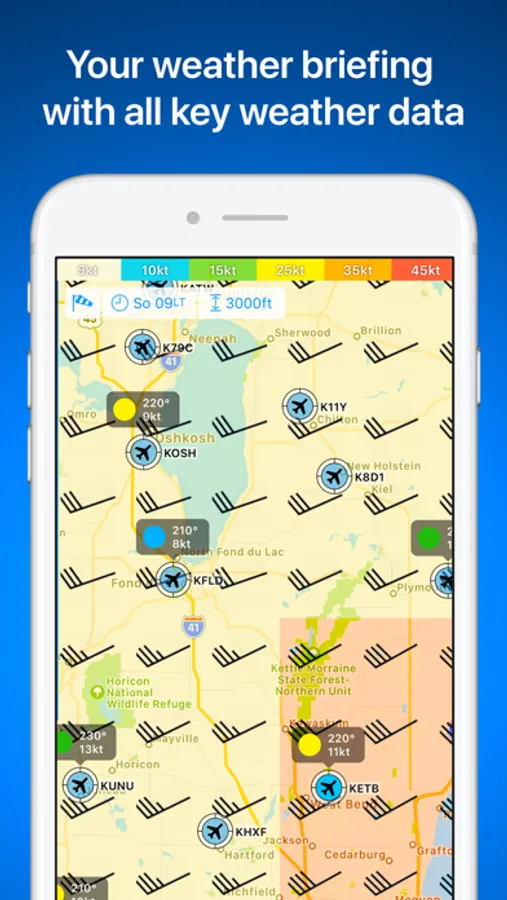 See a visual display of the METAR and flight conditions on the map. In addition, you can see the decoded METAR with wind, clouds, gusts, and visibility on the airport's detail page.