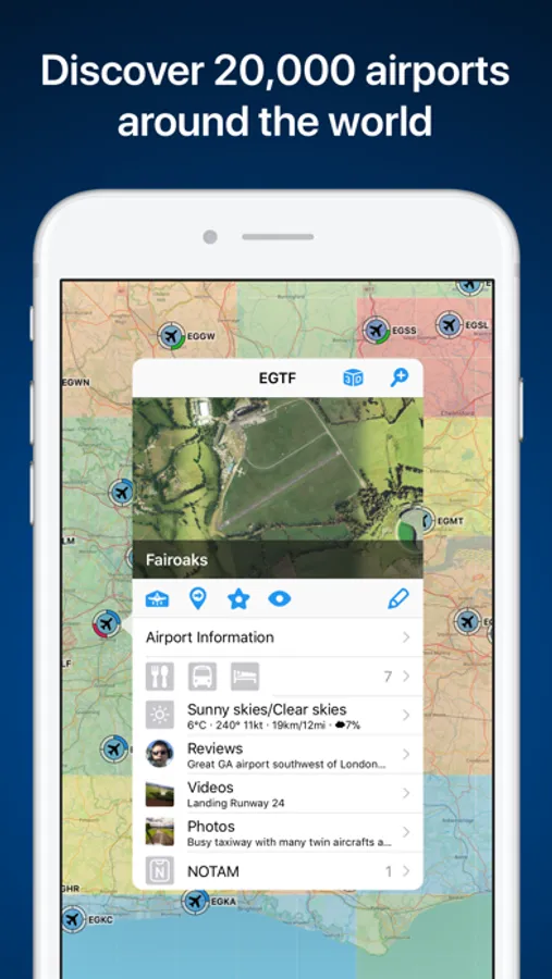 Search by name or ICAO to discover new airports. Receive important information such as the address, position, runways, and airport restaurants. Mark and save what airports you’ve already flown to or those you’d like to fly to next. Save your personal notes for every airport.