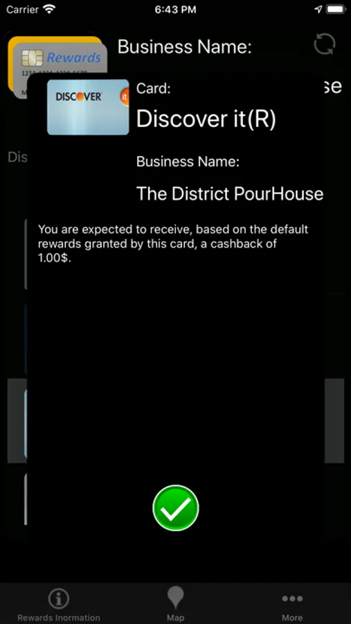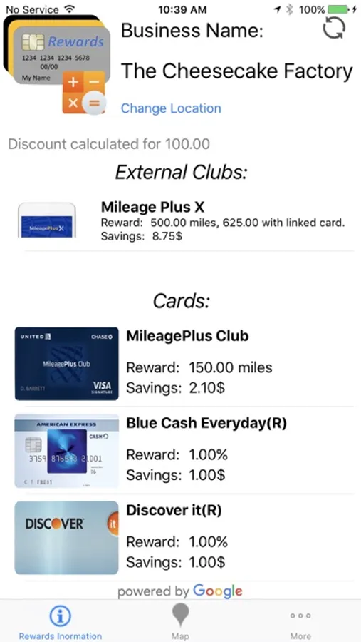 Once you have added the credit card types you have (we don't need any information that is printed on the credit card itself, only its type), we will recommend you which card should give you the highest rewards worth in the businesses you're currently at.