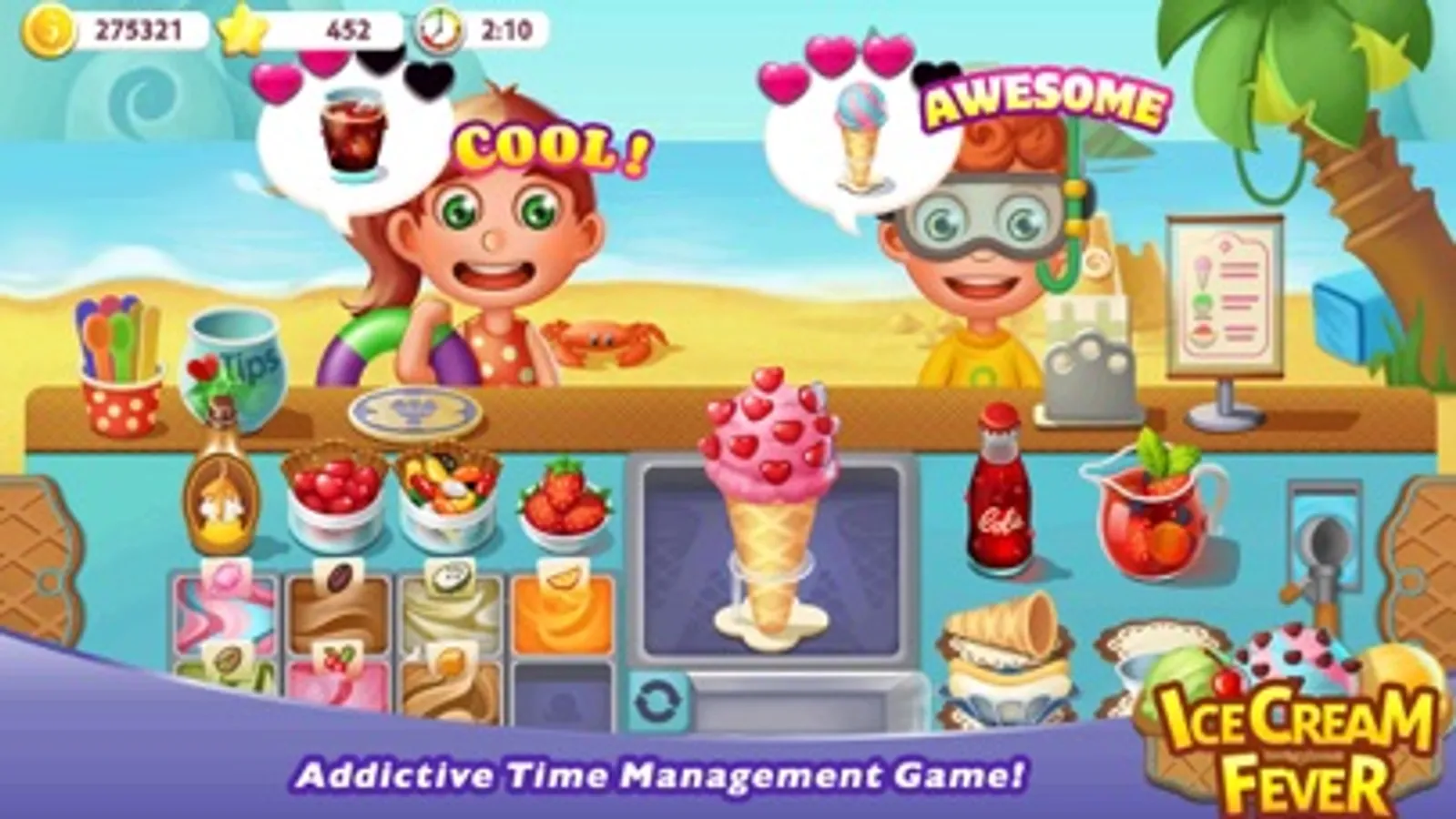 Start your own new ice cream business now! Work as a chef in the lovely beach and prepare super smooth and creamy ice cream cones for yours customers. Mix and match 40 different ice cream favors and toppings to make hundreds of different yummy ice cream treats! Upgrade your equipment, buy bigger ice cream stands, and invest in advertisements to create the biggest ever ice cream sensation in town! Unlock new ice cream favors as you progress to produce an even greater variety of treats! Collect tons of tips for excellent service and make those profits!