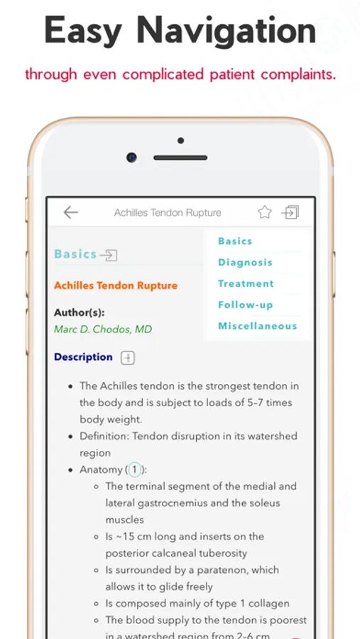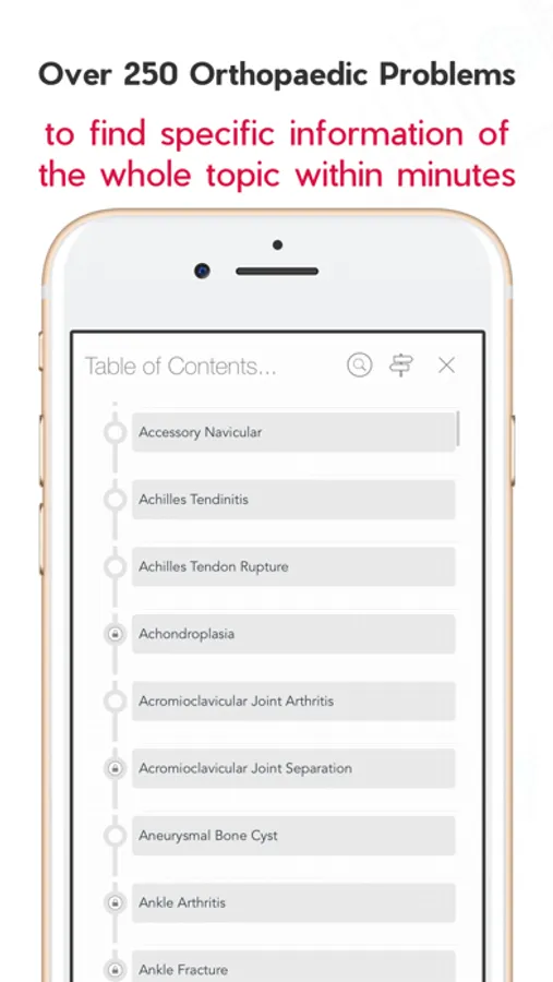 Over 250 orthopaedic (orthopedics) conditions. Diagnosis section for conditions. Easy navigation. Alphabetical organization. Download the FREE app which includes ~ 10% sample content.