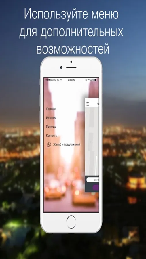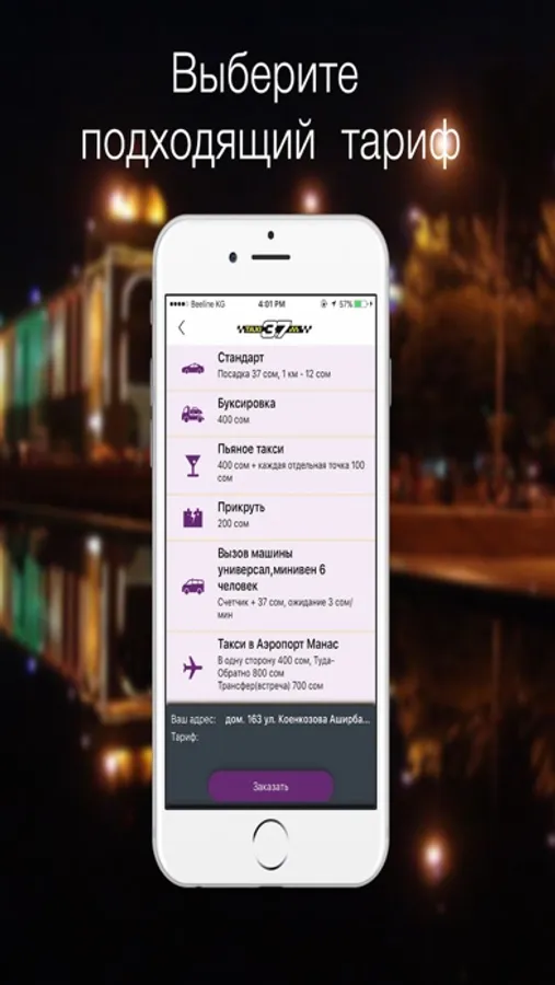 В нашем приложение вы можете выбрать подходящий вам тариф или воспользоваться дополнительными услугами: стандарт, минивэн, предварительный заказ, аэропорт, мото такси, буксировка, пьяное такси, мото такси.