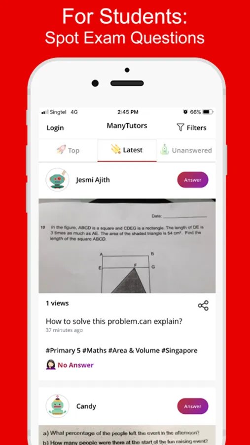 • Provide Answers — Provide answers whether you are a student, parent or tutor. Help other students in need, or showoff to others that you know the answers. If you are a tutor, your chances of landing jobs will increase.