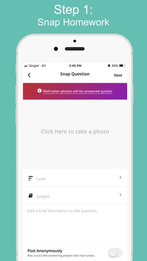 Ask ManyTutors provides solutions to your Singapore math and science homework. Snap a question with your phone and one of our 45,000 Singapore tutors will give you the solution within the day. Yes, these are real people, so feel free to ask difficult problems.