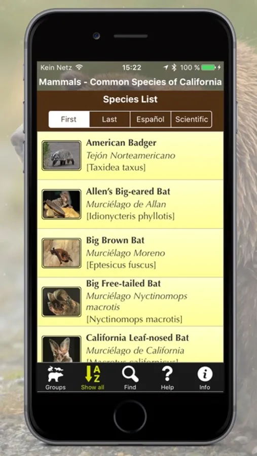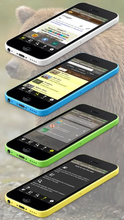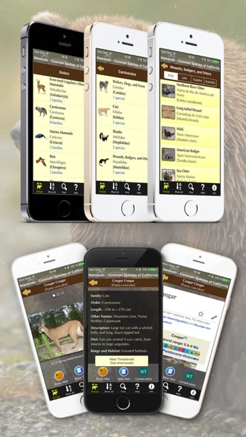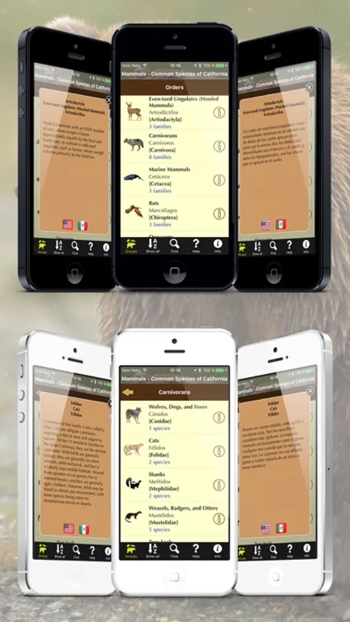 This app shows more than 70 mammal species found in California, including the marine mammals off the Pacific coast. For each animal there are two or more high-resolution pictures, a brief description, and a link to view the corresponding Wikipedia pages within the application window. All descriptive information is in English, the animal names are also shown in scientific (Latin) denomination and in Spanish.