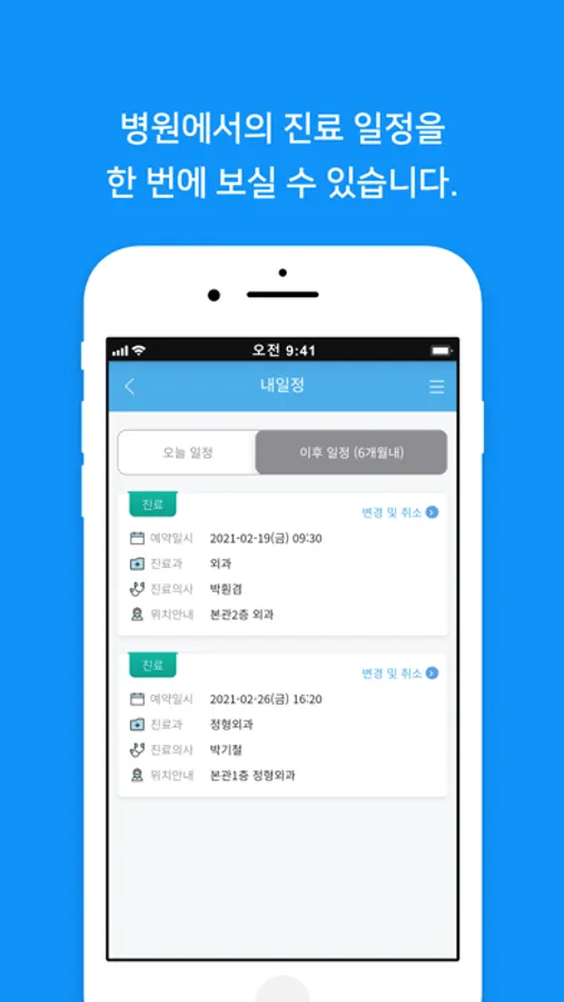 병원에서의 진료 일정을 한번에 보실 수 있습니다