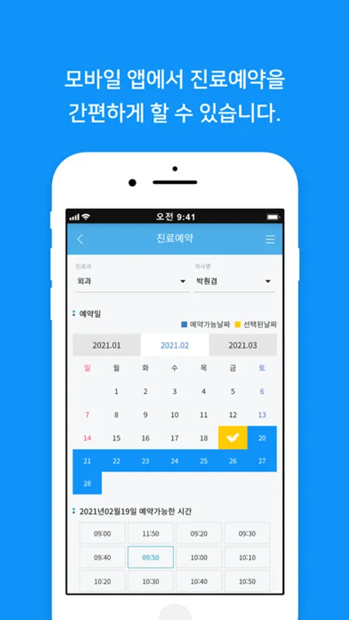 모바일 앱에서 진료예약을 간편하게 할 수 있습니다
